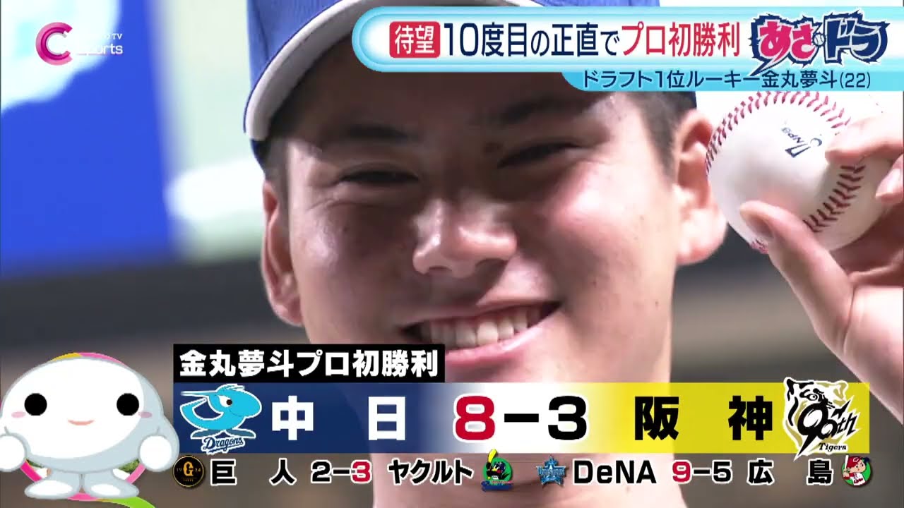 中京TVスポーツ スタンドにはこの日有給休暇を取り応援に駆けつけたご両親の姿初勝利を目指すドラフト [音楽] 1 位キー金丸夢がマウンドへすると初回から 2者連続の空振り三振 最高の立ち上がりを見せます。 打線はその裏ワンアウト 3塁1打先制のチャンス。バッターは3 番の岡林。 [拍手] セカンドゴロの間にドラゴンズ先生。 大事。大事。先生大事。うん。 しかし2回。 うん。 ああ。 ドラゴンズの中側に 1発を浴び。 タイガね。 タイガス。 タイガスの中。 タイガースの中側に 1 発浴びました。追いつかれてしまいます。 今日は許す。 すると3回。ノーアウト2 塁勝ち越しのチャンスでバッター得点剣打率 3割の田中行く。 よいしょ。 今調の田中の1だ。 ドラゴンズ勝ち越しに成功。 なおもチャンスで5番ボスラ。うわ、 [拍手] ライトへのタイムリーヒット。この回 1挙3得点。 過去埼玉の援護点を金丸にプレゼントします。 うん。 勝利投手の権利がかかる5回。2アウト3 塁1 塁。長打で同点のピンチです。みんな長度打りますからね。え、 [拍手] ご両親も片を飲んで見守ります。サドゴロチェイビスさばいて [音楽] [拍手] 1塁送球。ここを無失点 勝利投権利を得ます。 150km 前半のストレートを軸に事故最多いの 8回を3失点。打線も 8点の援護で勝利を後しり上が ご両親が見守る中止めの登板にして金丸願のプロ初勝利を上げました。 [拍手] ま、ずっと試合を見に来てくれてたので、え、なかなかいい姿を見せれなくて悔しかったんですけど、え、ま、 [音楽] 10 度目の正直ということで、え、勝つことができたので、え、いい姿を見せれたんじゃないかなと思います。順位はご覧の通りです。昨日 [音楽] [拍手] DNA が広島に勝利しため、ドラゴンズ再び 4位に浮上しています。