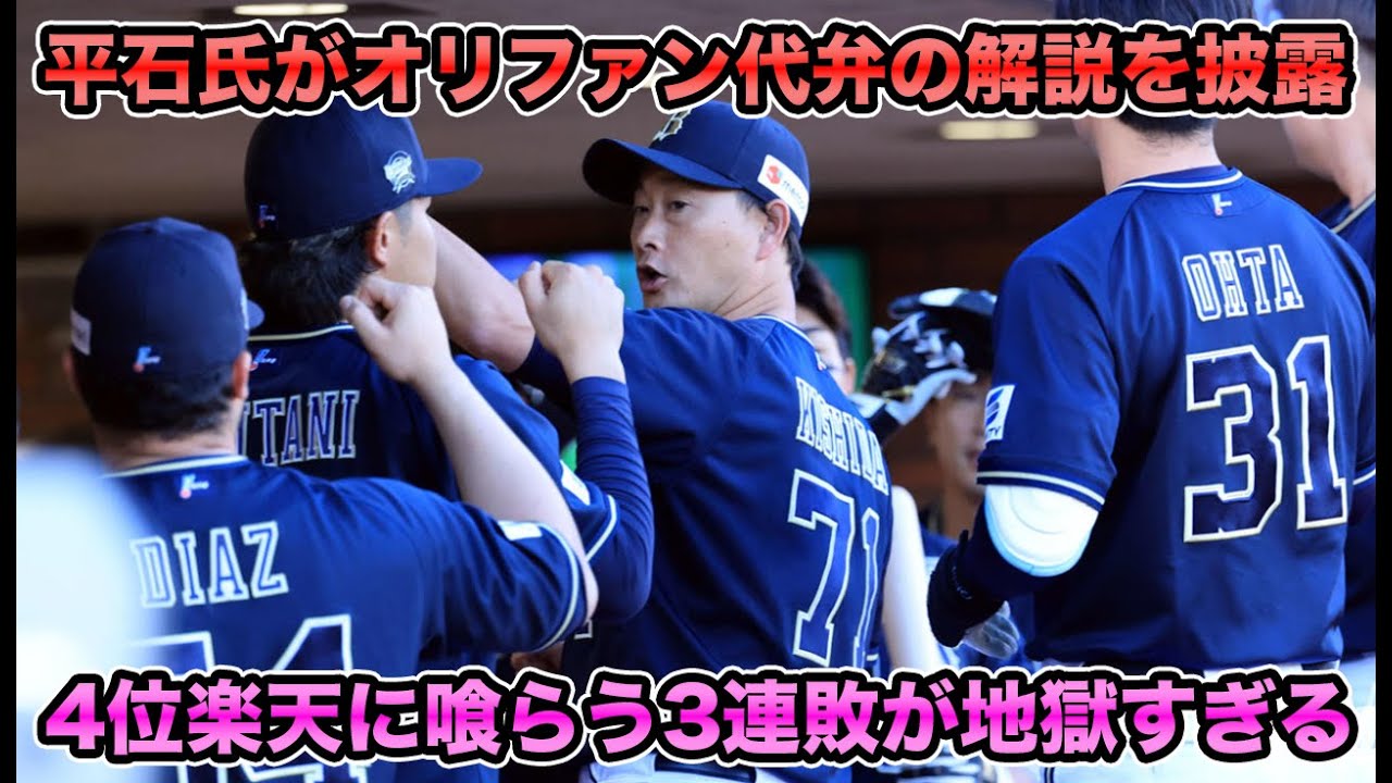 ふう。 いやあ、暑いね、毎日ね。 うん。あ、そう。いや、でも俺今年 食中毒なってないわ。うん。1兆円で なんかさ、直近2年ぐらい救急車呼ばせて もらってんけど、 今年はなんか耐えてるわ。めっちゃ気使っ てるもん。だって生肉触った時とかさ、 生魚触った時とすごいまな板洗ったりとか 手洗ったりとかあの洗剤でやったりしてる から逆に気つけてなかったの。うん。もう あれま、むっちゃしんどいわね。 めっちゃめっちゃしんどい。うん。体の 水分全部持ってかれるから、ま、ほんま しんどいなという風には、え、思うんです か?あ、ごめん。ええ、これ生配信ちゃう か。すいません。はい。え、動画ですね。 どうもどうもちゃうねん。うん。動画やね 。うん。生配信かもだわ。はい。え、と いうことでございまして。オリックス負け た。 負けすぎやろ。おい、別に今に始まって ないけど負けすぎや。もうずるズると言っ てるやん。ソフトバンクに3盾てくらっ たりとか。日ハムに3盾てくらったりとか 。え、もう1位おったけどもどんどん2位 、3位と上がっていって本当に日本の GPN、GPちゃう、GDP見てるみたい やな。どんどんどんどん降りていって で、今日4位の楽天には3で食らって4位 になりかけている感じとか日本のGDP みたいでオフレックスな。ほんまえして くれ。ほん頼むでおい。 はい。なので、ま、逆転優勝という形で夢 見るのはちょっとも当にすぎてですね。 えー、今日勝てば楽天とは4.5ゲーム差 。負ければ2.5ゲーム差っていう風な 感じだったんで、ま、ゼガでも勝ちたかっ たと、え、いう感じですね。で、今日は 楽天がこう3立てしたんで、ソフトバンク 日本ハムにもですね、同じような戦いを、 ま、できるんじゃないかみたいなこと言う てましたけども、そんなないよ。昨日も ツイートした通り、ま、2強4弱なんで だいぶ12のゲーム差9.5でしょ? だいぶ差があるから楽天さんこんな感じで ソフトバンク日本ハも行けると思ってたら それはそれでちょっと甘いですっていうの は、え、一応順位が今上にいるオリックス だからこそ、え、言えるんちゃうかなと 思ってますけれども。ま、負けだね。 さすがに辛すぎて、え、動画を出しており ます。はい。是非皆さん見てる方いたら コメント欄ください。はい。コメント欄 くださってないねんな。で、今日のスタメ なんですけどもね、番出てますね。ま、 今日はあの、ま、大きく分けるとですね、 2つちょっと、えー、改善点というかです ね、え、伸び代の部分があるんじゃないか なと思ってまして、その1つがスタメンな んですよね。ずらっと出てます。はい。 えー、ま、気になるポイントで言うと5番 に若選手が入っているというところですね 。これは正直めちゃくちゃ素晴らしい。の ツイートで言いましたけども、どうせなら へんやろうけど、次の日は服中になるん でしょうけど、次出す時は5番若つなんて 見たいななんていう風に言いましたけども 、ま、実際本当になりましたね。え、 めちゃくちゃ楽しみでしたよ。なんやっ たら4番とか3番とかもあるんじゃないか なっていうぐらいものすごいやっぱ調子が いいですし、これをなんか調子がいいのも もちろんそうなんですけど下手したらもう そういう選手になりつつあるかもしれない んでもう若月選手とってはもう潜在1グの チャンスなんじゃないかなと思う一方で 買打線見て欲しいんですけどね。8番に 福田、9番にオリバレスとえいうことで しかもオリバレスはレフトで守備について います。はい。ま、最近の試合とかでもね 、え、犠牲フライでちょっとこう生成こう 生感許したりとか、ま、なかなかやっぱ 守備厳しいんで使うとしたらDHだろうと 。ただやっぱDHで使うほどのやっぱ打力 ではないと。え、試合でこう守備に つかせればダイソなりとかでやっぱこう こう変わるタイミングがありますから、 そういったのもあってレフトにつかせただ と思うんですけど、ま、守備力は正直 ちょっと目を潰れない感じだと思うんで、 やるんだったらDHで、DHが無理なん だったらもう出さないってのが一番いいん じゃないかなと、え、思ったので、ここ どうなんのかなと。負ける時にはここが かなり、え、影響してくるんじゃないかな という風に思ってましたが、案の上なり ました。で、初回から見ていくとですね、 オリックスめちゃくちゃいい攻撃してたん ですね。非常にもったいなかったです。だ から共同取ってるんですけど、え、大量2 番、トング3番。この2人で連打で チャンスを作ってるんですよね。で、 トングに関しては3番タイプじゃないん ですけども、え、やっぱこう繋いでいくと いうことでオールスターでホームラン2発 打ちましたから新庄監督にも2番トング どうなんだろうみたいなこと言われてまし たけども、本人ね、やっぱこう調子が良く なるとホームランを狙ってしまうと、え、 いうのは、ま、本当良くないっすね。はい 。量も外のボール苦手なコース