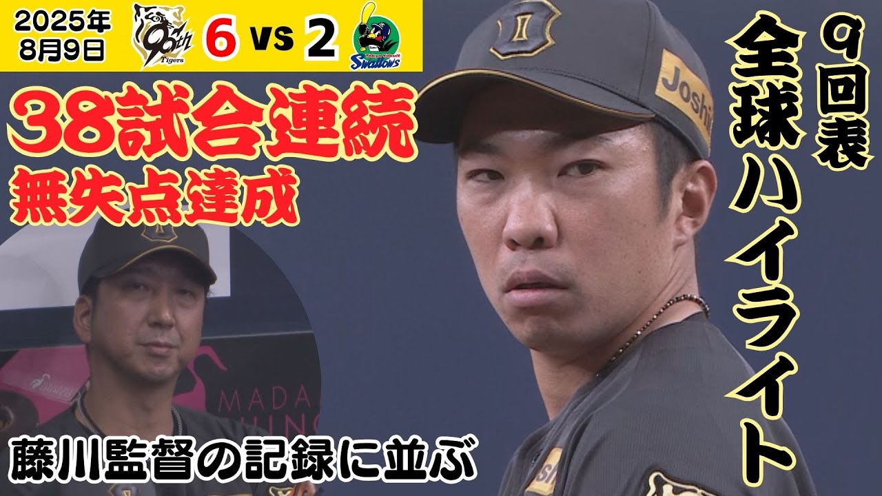 [音楽] 4点リードの9回の表、現在 37 試合連続無視点中という石井大地がマウンドに上がりました。 [音楽] セリーグ記録監督が 2006年に記録しました。38 試合連続無点。 6番 この記録まで山 あと1 試合に迫っているこの石井大地です。加野さん はい。4 点差ですが、ま、 1 位大地が投げるということになりましたね。昨日も登板があります。連頭になるこの石井先頭バッター山鉄空振り三振。ワンアウトランナーありません。 [拍手] 7番 浜中さん37 試合連続無視点中というこの記録に対してはい すごいですよね。だから37試合で点1 点ですか? 自点がそうですね 4月の4日巨人戦東京ドームで記録した 1点のみでま、それも 6 点リードの9 回に登板したという、ま、シチュエーションだったんですよ。 4月の4日です。 はい。それまでずっと抑えてるわけですもんね。 はい。ま、ちょっとあんまり聞いたこと、 聞いたことないですよね。 平が記録した記録ですね。 うん。 サードゴテ明がさばいて 2アウト。お、 39 ってことはもう少しでいくんじゃないですか? そうなんです。 37 今日で 今日でや38ですか。38 あの藤監督と並ぶですよね。 これがセリーグ記録にはなるということ。 日本記録が次でになるってことですね。 その記録もシーズン全倒するんじゃないかという だけしますよ。 ここも2球で追い込みました。 最後はストレート。 152km見逃す三振。3 アウト。石井太大 38 試合連続無失点。セリーグ記録川監督に並ぶ。見事な投球で閉めてタイガース [拍手] 6対2で勝利。 タイガースが勝ちました。 勝利投手投手は 最後まで見事な投球を見せました石 [音楽] 近本の8 回貴重なタイムリースリーベースさらにはこの押し出しのフォアウォールタイガーズが終盤に一気にリードを広げてそ [音楽] ゼロを刻み続けている石井が最後閉めました。か野さん、最後のストレートも見事な [拍手] [音楽] [拍手] 1球でしたね。 いや、あれはもうバッター手出ないんじゃないですか。そこに 152km投げられたらね。 ま、本当に、ま、先ほど言いましたけど、コントロールもいいですし、 威もあるし、変化もしっかり投げれるしってなると本当にこの記録はどんどんどんどん伸びていくんじゃないかなという感じはしますね。 [音楽] ええ、セリーグ記録に並ぶ、藤川二監督に並ぶ 38試合連続無失点。 [拍手] う。