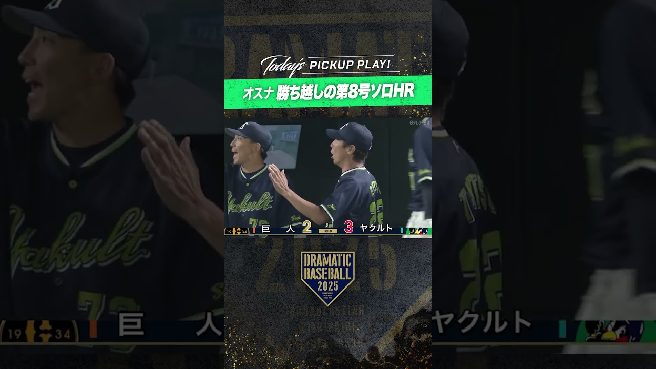 インコース引っ張った。鋭い当たりは あーっとボールに当たりました。 インコースを捉えたオス。 レフトポール直撃のホームラン。第8号が 出ました。 通列な当たりはレフトスタンドのボールを 直撃しました。勝ち越しのホームラン3対 2 宮さんもこれはオスターを待って選って打てたホームランでしたか。 まあそうですよね。あのやっぱ 1 球外変化球スライダー系のボール投げましたよね。 あれは完全ボールになりましたよね。え、 ああ、 もう完全にもう前球シュート待ってましたから で待ってたボールが来たと。 ま、そうですね。のこう高めに行くと このオスナも無駄不在の間は主に 4 番を打ってきました。でも難しいボールは難しいボールですけどね。 思いますけどもね。Ja.