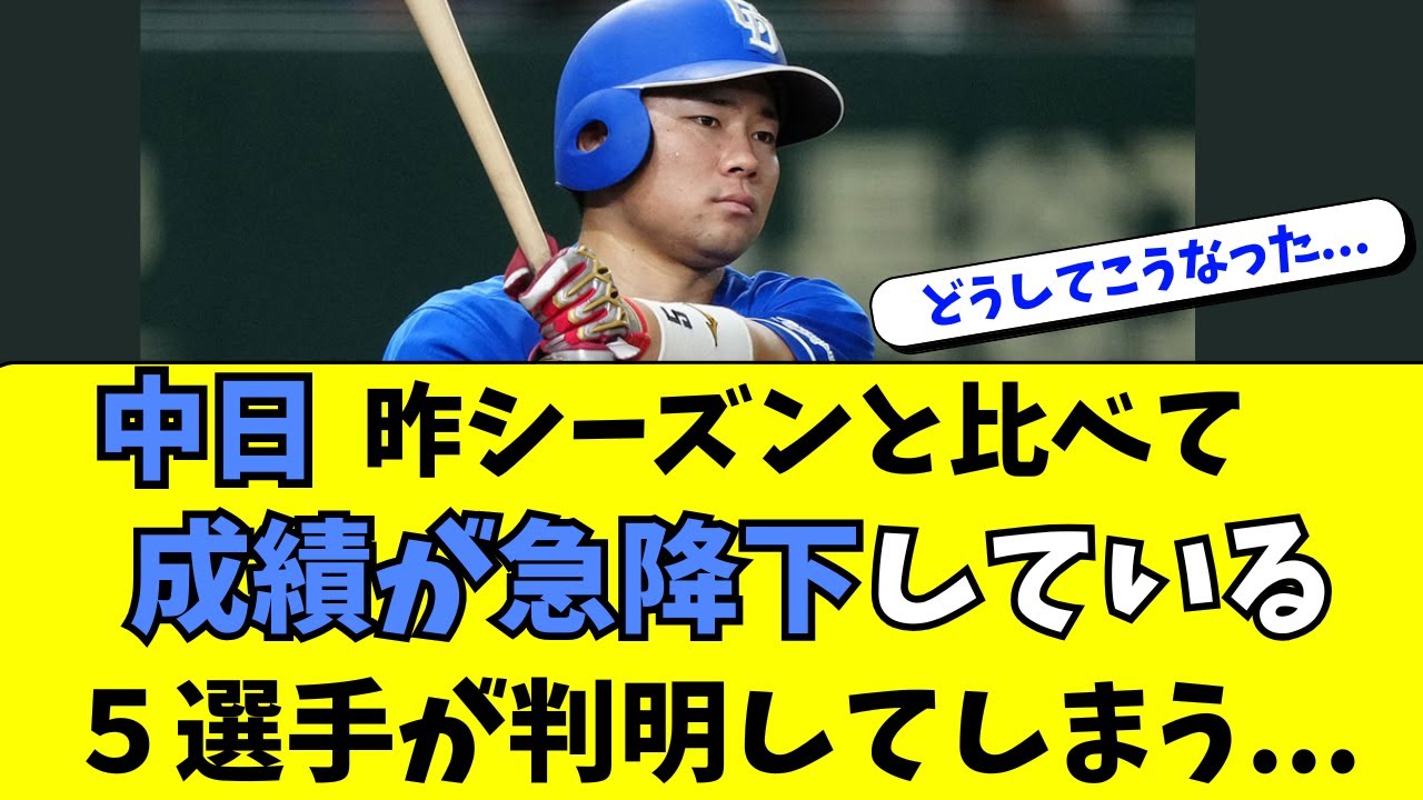 中ドラゴンズ昨シーズンと比べて成績が 大きく加工してしまっている5選手につい て見ていきたいと思います。 成績加工率ワースト5位が勝つの投手28 歳7年目。2023年はリリーフ ピッチャーとしてブレークして50試合 20ホールドを達成しました。その疲労も あってなのかこの2023年はブレイクし たシーズンでしたが終盤で離脱もありまし た。昨シーズンは開幕直後は苦戦しました が、それ以降は後頭を続けていました。昨 シーズンはトータルで39試合投げて防御 率が3.51。そしてですね、ホールドで 見ると7つという成績になっています。 今シーズンは4月の中旬から3試合連続の 失点で。ただ平均休速で見ると154km 近いボール投げていまして、ボールの スピードは過去最高なんですね。ただ7月 に入って、ま、さらにですね、失展が重ん でしまって、結局現状は登録マシとなって いて調整中ということになります。5月は 防御率1点台前半でこの月は良かったん ですけれども、他の月はですね、並失点が 多くて防御率5点を超える数字になってい ます。今シーズンはここまで23試合防御 率が5.00。4勝4敗でホールド1、 27エイニングフォアボール11個脱三振 34個で左率が2割67人が1.41と いう成績になっています。三振取れてい ますし、平均急速も上がっているんですが 左率が高めでフォアボールも多めでVIP がかなり高めの数値になってしまってい ます。こっからなんとかですね、副調に 期待しましょう。では続いてですね、昨 シーズンはレギュラー級だったあの選手も 成績が大きく加工ということで見ていき ます。 成績加工率ワースト4位がカリステ選手 33歳3年目。昨シーズンは114試合 出場しまして約400打席立ちました。 そしてホームラン7つにOPS639を 記録。ま、打撃成績がとてつもなく良いと いうわけではないですが、ユーティリティ 性が高くて、誰かがポジションかけたら そこにこうカリス選手が入っていくとよう な感じで講手に活躍を見せて結局1年通し てみればレギュラーに近いようなそんな 成績を残しています。ま、今年はですね、 ボスラー選手とどっちが開幕スタメンかと いうところですね、井上監督が争わせた わけなんですけれども、ボスラー選手が 離脱して開幕からスタメンで起用されまし た。ただシーズン通して目立つほどの活躍 っていうのがなかなかできない状態が続い てコンディション不良なんかもありまして 現在は2軍で調整中です。ま、ファースト であったりレフトであったり、ま、基本的 にはバッティングが求められるポジション 2つでの器用っていうのが目立ったんです けれども、やっぱりこの辺りのポジション を守りにしてはちょっとバッティングが 物足りないかなっていう感じはありますね 。チェイビス選手が加入して外国人枠の 関係もありますし、ま、現状ではなかなか 一軍に上げるのが難しい状況です。ま、来 シーズンの残量っていうのも、ま、正直 微妙な状況化で、こっからなんとか 巻き返して来シーズンの契約を勝ち取り たいところです。今シーズンは61試合の 出場で2割2部7輪、ホームランがわずか 1本、打点が14、出塁率2割7部分2輪 、OPSが579とな成績になっています 。では続いてですね、今シーズンファンが 大きく期待したあの選手も成績が大きく 加工ということで見ていきます。 成績加工率ワースト3位が佐藤竜星選手 28歳7年目。昨シーズンは2年続けて バッティングで結果を残しまして レギュラー角と言えるところまで対当して きていました。通算でま、打率に対して 出塁率が9部ほど上回っていて、本当に フォアボールを選ぶことができるとそんな 選手です。ま、昨年のボール玉見極め率が 80%と素晴らしく先が良かったです。 今年昨シーズン成績見ても2割4部4輪で 打率こそそんなに高くないんですけれども ホームラン7本出て率3割3あっては 720と合格水準の成績を残しました。 今期はサードと中軸っての辺りがなかなか 固まらない中で即レギュラー候補として この佐藤選手獲得されたわけなんです けれどもなかなか成績が伸び悩んでいます 。そしてチェイビス選手の加入もありまし て入れ替えで7月の下旬から2軍での調整 が続いています。ここまで1軍で23試合 の出場で打率が1割部7輪、ホームラン なし打点が3つ、数類率が2割8部、 OPSが522という成績になっています 。ま、もしかすると今年ずっと2軍での 調整が続いていて、そっからいきなり1軍 に上がってきたので、こうトレネードで 加入して、ま、1軍レベルのピッチャーに 対応できなかったという可能性もあります 。なのでですね、もう1回再生して一軍で 活躍できるような、ま、そんな状態を見せ て欲しいなという風に期待しています。で は続いてですね、昨年のレギュラー角の ところから急落してしまった選手見ていき たいと思います。 成績加工率ワーストニーガ村松選手24歳 3年目。昨シーズンは109試合で2割 7ぶ5輪。ホームランが1本。OPS 664で、ま、ショートのレギュラーは もうほぼほぼ村松選手で