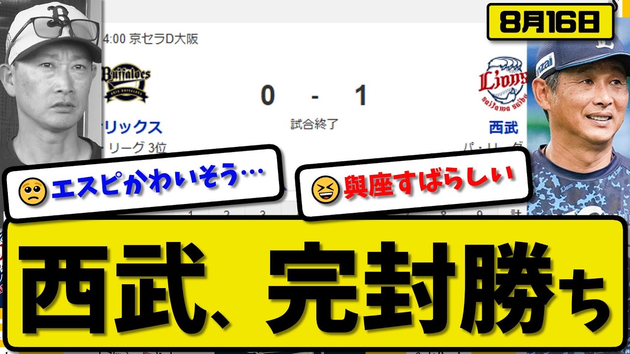 【パ3位vs5位】西武ライオンズがオリックスバファローズに1-0で勝利…8月16日完封勝ち…先発與座6回無失点…外崎が活躍【最新・反応集・なんJ・2ch】プロ野球