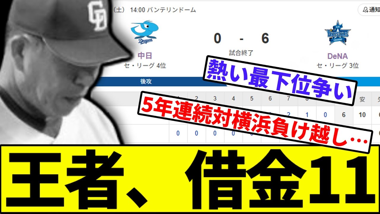 【6666が見えてきた】王者、借金ワーストタイ11へ【なんJ反応】【なんG反応】【プロ野球反応集】【2chスレ】【5chスレ】【巨人】【阪神】【中日】【横浜】【ヤクルト】【カープ】【ボスラー】【藤浪】