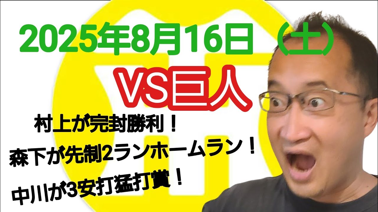 【阪神タイガースについて語る動画】2025年8月16日(土) ● 巨人 0 × 3 阪神 ○ 村上が完封勝利! 森下が先制2ランホームラン! 中川が3安打猛打賞!