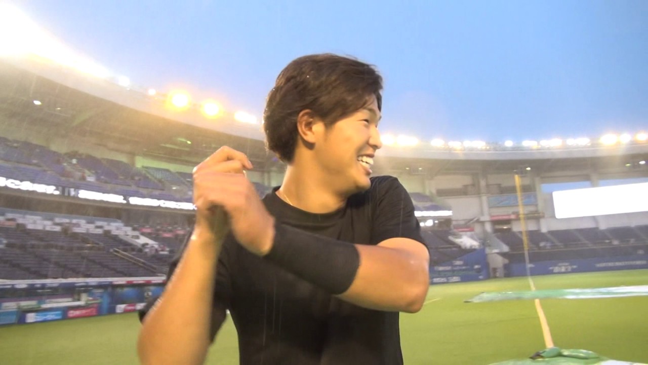 本日の試合は残念ながら雨天中止に…最後に中村選手が雨の日ヘッドスライディングの練習を行いました。次回は中村選手も雨の日ヘッドスライディングをしますのでお楽しみに!