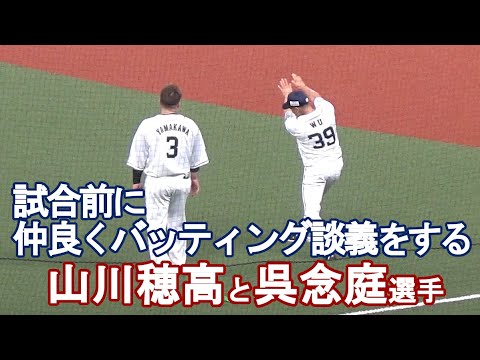 西武の山川穂高選手が、試合前に呉念庭選手と