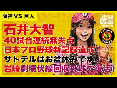 『阪神VS巨人』石井!40試合連続無失点日本プロ野球新記録達成!サトテルはお盆休みです。岩崎劇場伏線回収投球で復活!