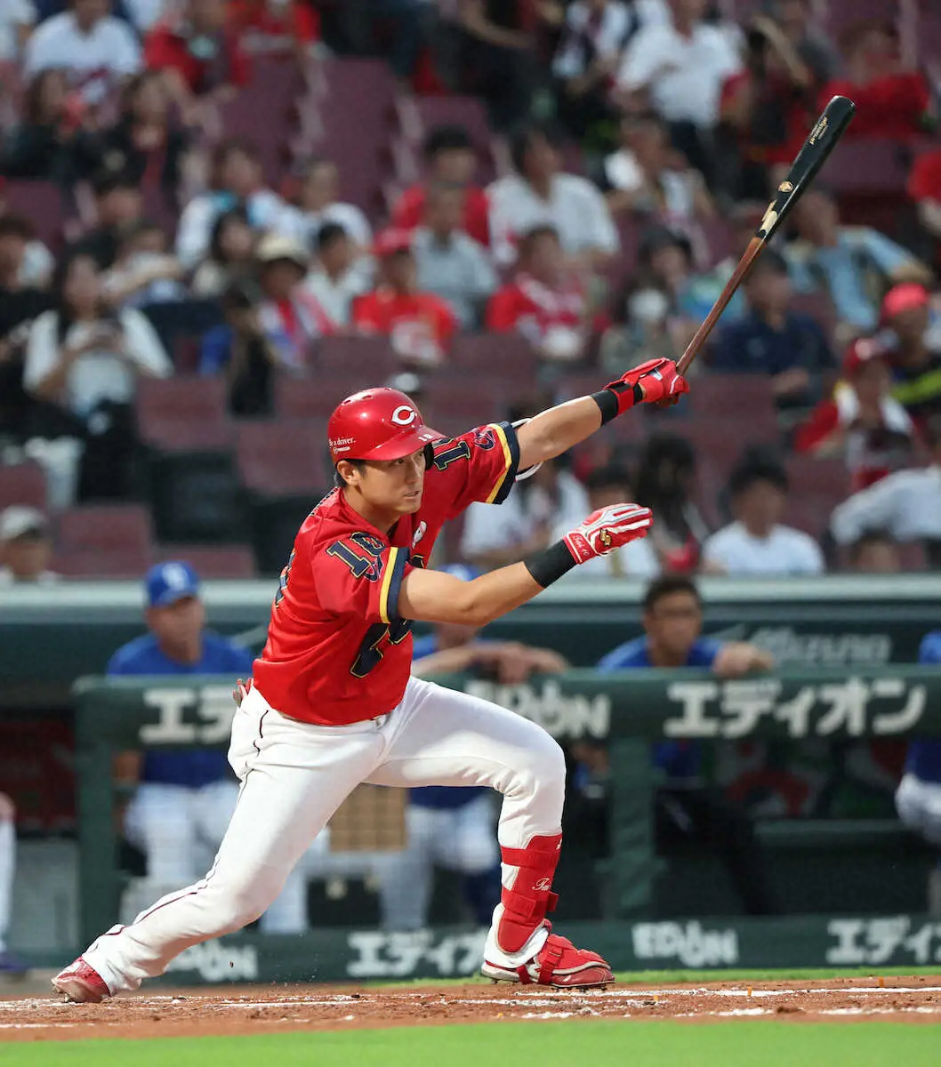 <広・中>2回、佐々木は先制適時打を放つ(撮影・平嶋 理子)