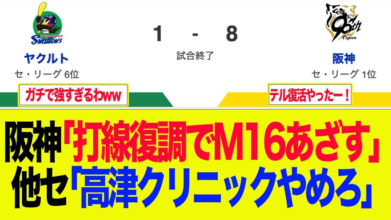 【阪神】阪神「打線復調でM16あざす」他セ「高津クリニックやめろ」 プロ野球ファンの反応集