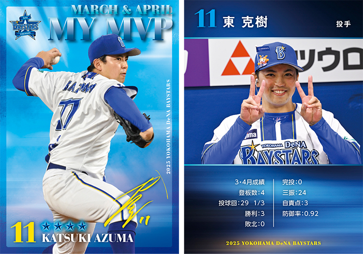 今回追加されるカードは、「MY BAYSTARS」アプリにて3・4月の観戦記録の投票で見事「みんなのMVP」1位に輝いた東克樹選手のMOVIE付き☆☆☆☆スペシャルカード1種!