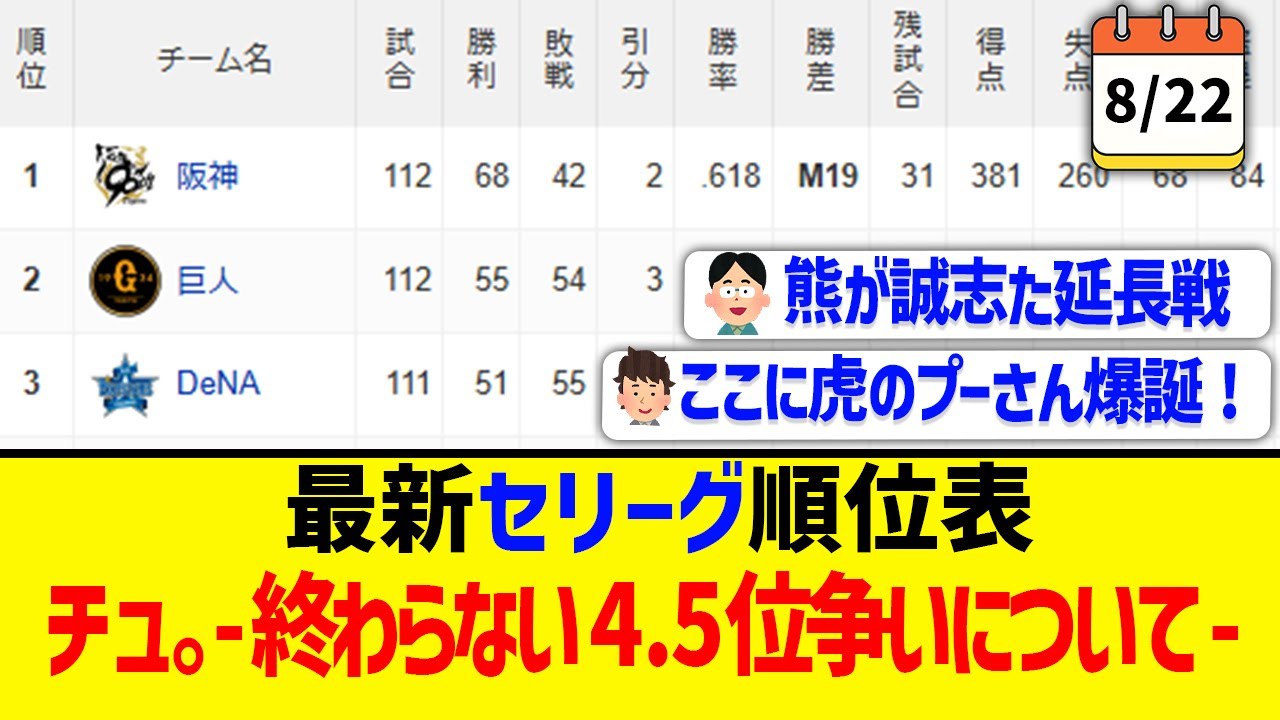 【8月22日】最新セリーグ順位表 『チュ。-終わらない4.5位争いについて-』 #阪神タイガース #読売ジャイアンツ #広島カープ #横浜DeNAベイスターズ #東京ヤクルトスワローズ #中日ドラゴンズ #プロ野球ニュース #ハイライト BGM / えだまめ88様 https://www.youtube.com/@edamaaaaame88 #プロ野球2ch2ch反応5chChunichi Dragonsセ・リーグなんGなんJパ・リーグプロ野球ニュースまとめヤクルトスワローズ中日ドラゴンズ反応集巨人広島カープ横浜DeNA野球阪神阪神タイガース NPBHUB.COM | The Fanbase of Nippon Baseball & Nippon Professional Baseball
