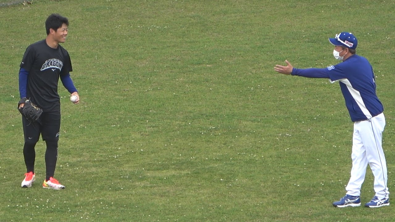 キャッチボール中の松田に声を掛けて話をする立浪監督 (2022/02/12)