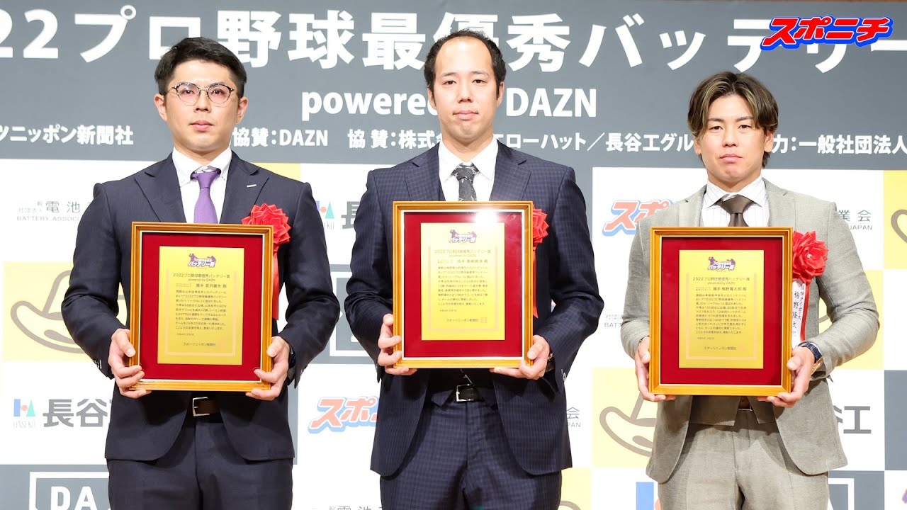 スポーツニッポン新聞社が制定する「2022年度プロ野球最優秀バッテリー賞 powered by DAZN」の表彰式が7日、東京都文京区の東京ドームホテルで開かれた。パ・リーグはオリックスの山本由伸投手(24)―若月健矢捕手(27)、セ・リーグは阪神の青柳晃洋投手(28)―梅野隆太郎捕手(31)が選ばれた。