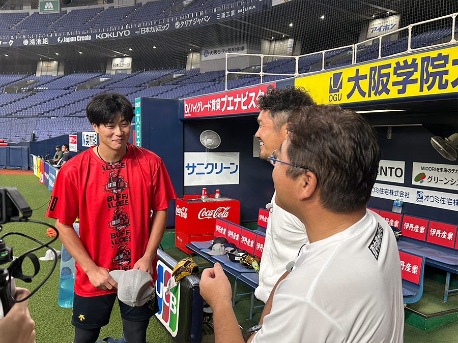 試合前の練習見学では、レジェンドの二人に選手たちが続々と挨拶に訪れます。真中さんが東京ヤクルトスワローズの監督だった時に在籍していた廣岡大志選手も登場。久々の再会に二人とも顔をほころばせます。