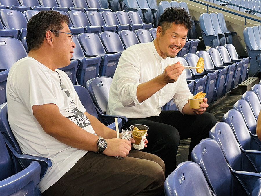 この日は、朝9時から夕方4時頃までみっちりロケ。さらにナイター開催日だったため、T-岡田さんはロケ終了後にラジオの解説へ。朝から晩までフル稼働した球団アンバサダーでした。