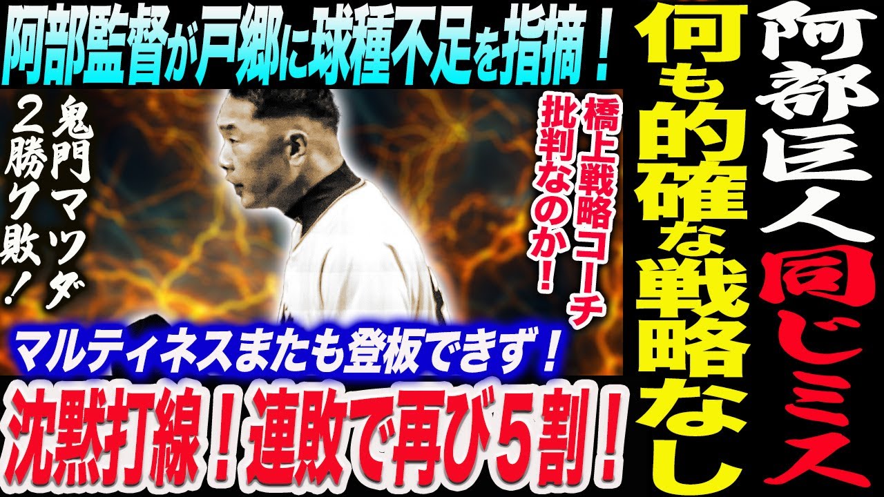 阿部監督が戸郷に球種不足を指摘!同じミス何も的確な戦略なし!橋上戦略コーチ批判なのか!沈黙打線!連敗で再び5割!マルティネスまたも登板できず!読売巨人軍 ジャイアンツ 巨人 GIANTS 阿部監督