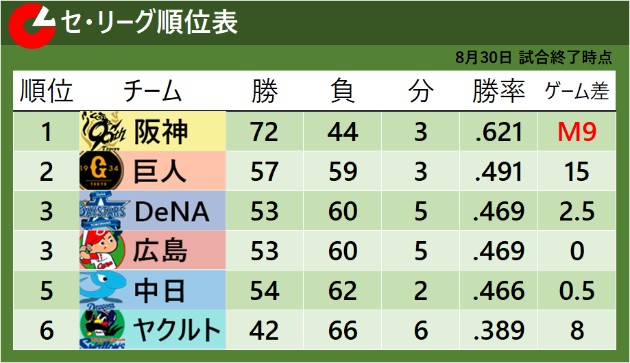 【セ・リーグ順位表】阪神が接戦制し優勝Mは「9」 ヤクルトは村上宗隆が3本塁打 中日は延長11回に4得点で4時間超えの激戦制す(2025年8月30日掲載)|日テレNEWS NNN  日テレNEWS NNN【阪神】「お子ちゃまレベル」「ひよっこ」藤川監督がテレビインタビューで珍しく厳しい言葉(日刊スポーツ)  Yahoo!ニュース阪神が優勝マジック「9」でカウントダウン開始 先制打の森下「ホームで暴れたい」  産経ニュース阪神・熊谷、決勝押し出し四球! 九回守備では佐藤輝の後逸をカバー「試合中は集中力が切れることはない」  サンスポ[セ・リーグ][プロ野球]阪神逃げ切りM9[  沖縄タイムス社