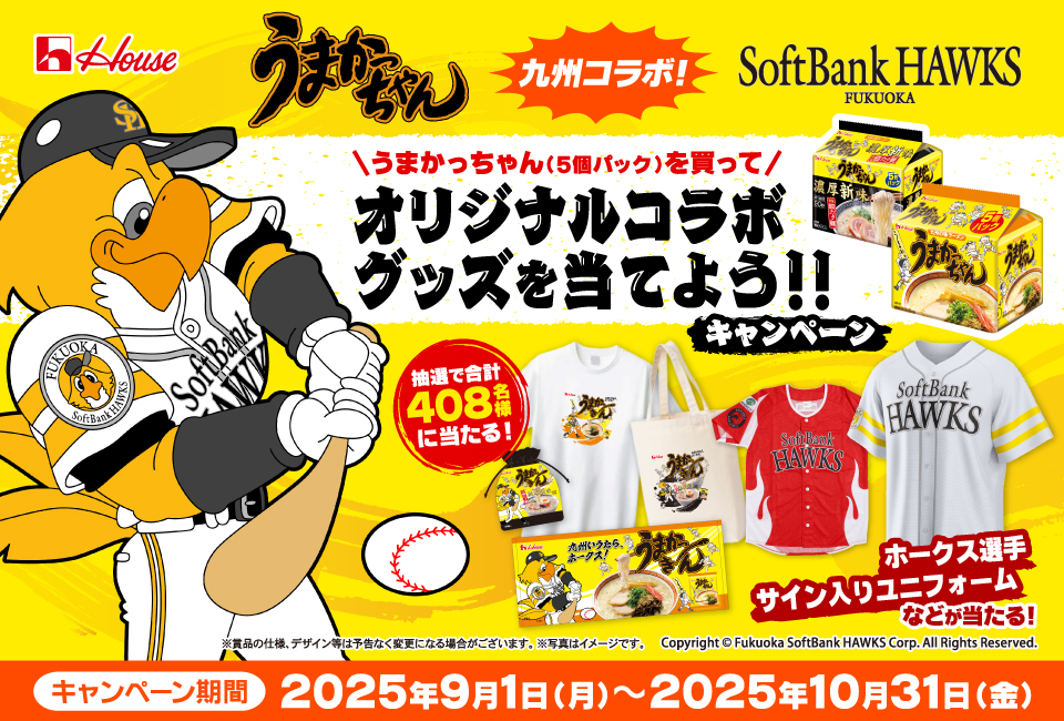ハウス食品は、九州でお馴染みとんこつ味の袋麺「うまかっちゃん」とホークスがコラボした『九州コラボ!うまかっちゃん 福岡ソフトバンクホークス オリジナルコラボグッズを当てよう!!キャンペーン』を2025年9月1日(月)~10月31日(金)の期間で実施します。対象製品1個以上を含む、合計550円(税込)以上購入し応募すると、ホークス選手サイン入りユニフォームや限定コラボグッズなどの賞品が、抽選で合計408名に当たります。