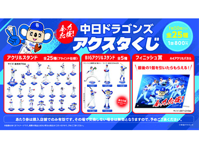 株式会社ジュウロクホウイ(本社:東京都千代田区、代表取締役:赤松 武雄)は、株式会社中日ドラゴンズ監修のもと、中日ドラゴンズ 井上監督と19選手、マスコット「ドアラ」5種の肖像を収録した「2025中日ドラゴンズ 全力応援!アクスタくじ」を発売いたします。選手の肖像は試合時のプレー画像を使用し、迫力あふれるアクリルスタンドとなっております。発売日は9月17日(水)に決定いたしました。東海地区・関東地区・関西地区を中心とする書店他にて店頭販売となります。詳細は下記リンク先の発売概要ページをご確認ください。