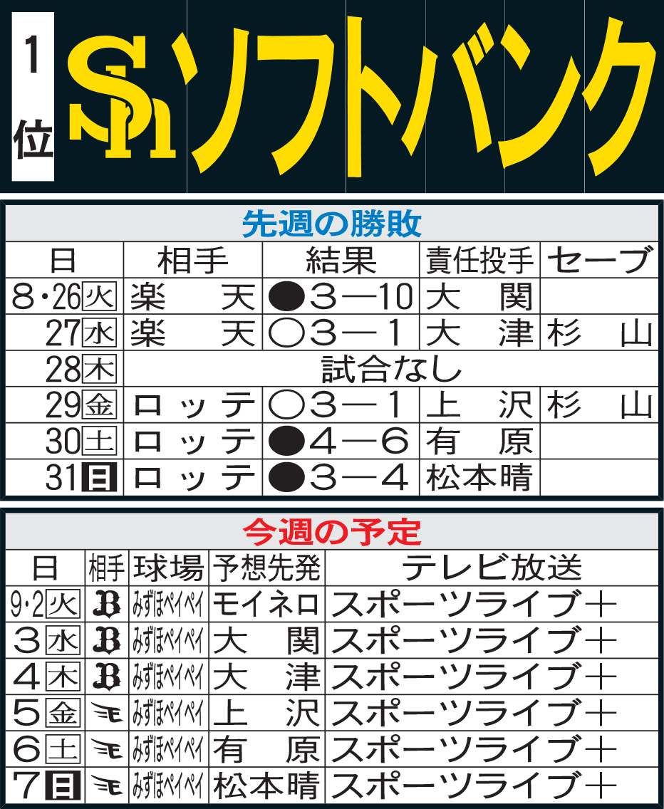 【ソフトバンク】先週のMVP&今週の展望 オリックス、楽天とのホーム6連戦で首位固めだ!(日刊スポーツ) – Yahoo!ニュース  Yahoo!ニュース400犠打の記念ボード…作らなかったのは今宮健太の”要望” 細部まで詰めた大偉業の裏側  鷹フル<達成記念企画>中村晃選手通算1500安打達成!  福岡ソフトバンクホークス【ソフトバンク】先週のMVP&今週の展望 オリックス、楽天とのホーム6連戦で首位固めだ!  スポーツブル【パ・リーグ】先週のMVP&今週の展望 ソフトバンク、ホーム6連戦で首位固め  nikkansports.com