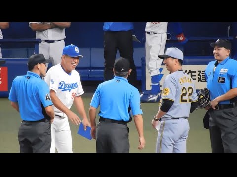 【笑顔のメンバー表交換】藤川監督 井上監督が笑顔でメンバー票を交換 それぞれ予祝ハイタッチを行い士気を高める