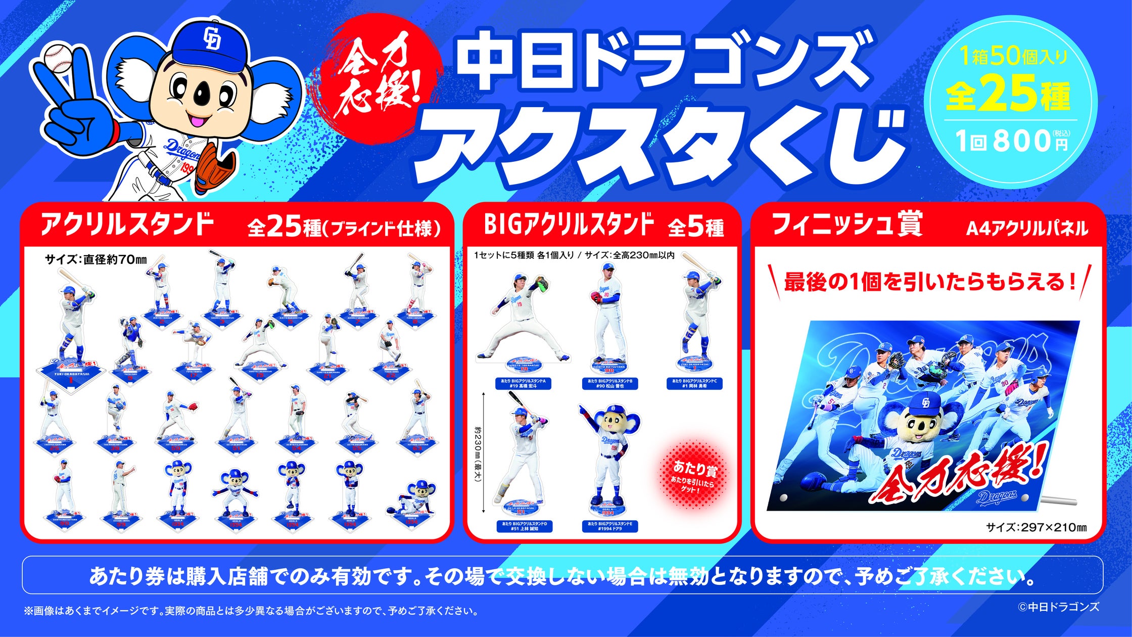 アクリルスタンドは飾りやすい直径約70mmサイズで全25種類。井上監督と19選手、ドアラ5種で構成。アクリルスタンドをお買求めいただいて、あたりを引いたら【あたり賞】(BIGアクリルスタンド全5種)がその場でもらえます。さらに、最後のアクリルスタンド1個をお買求めいただいた方には【フィニッシュ賞】A4サイズのアクリルパネルをその場でプレゼント!