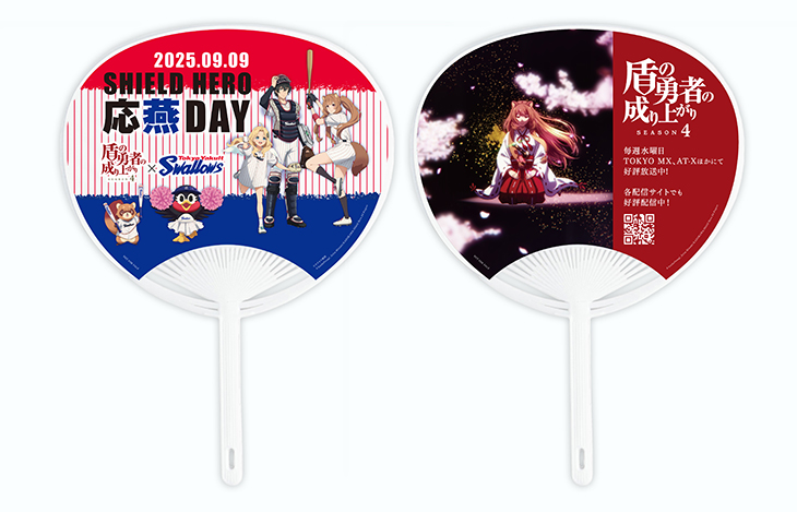 当日は来場者先着10,000名様に、今回のコラボのために描き下ろした盾の勇者の成り上がりのキャラクターと東京ヤクルトスワローズのマスコットのつばみのイラストが入った特製うちわを配布します。