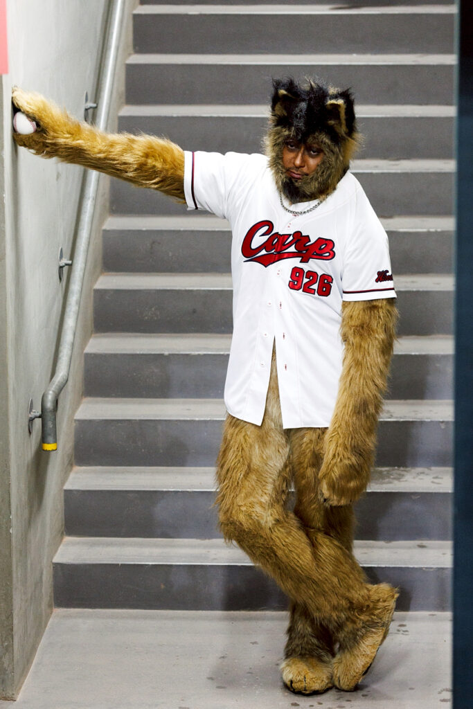 試合開始前、スタジアムDJに呼び込まれ、カープのユニフォームを着用しもこもこの犬姿で登場したオリバー。その姿に「オリバー!」と声をかけるファンも現れた。