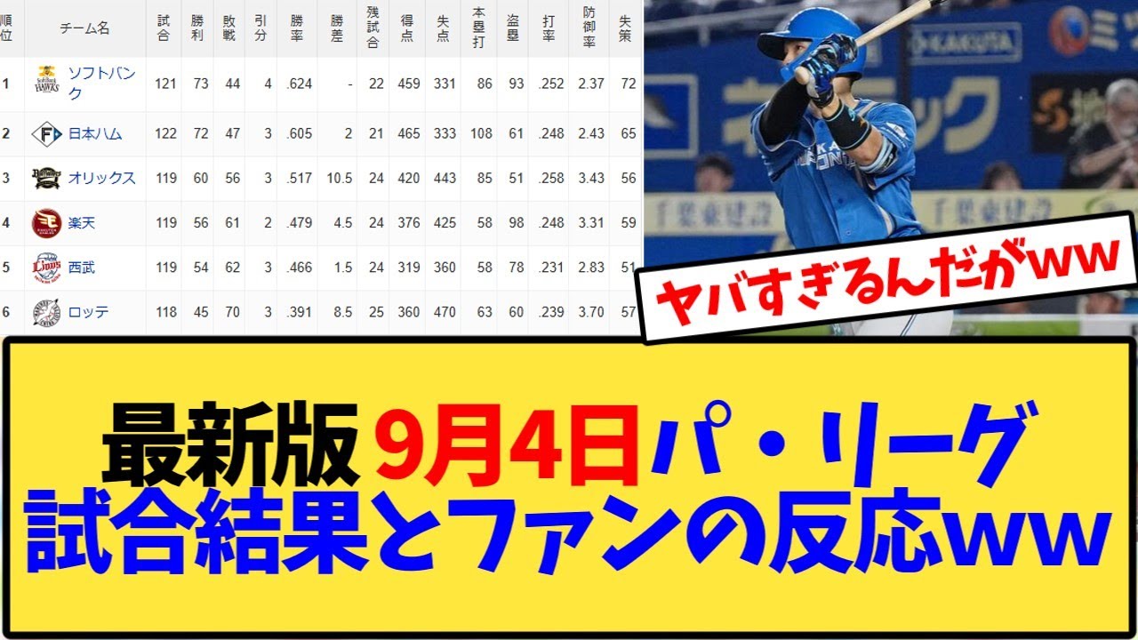 【最新版】パ・リーグ9月4日試合結果とファンたちの反応www【パ・リーグ】【速報】