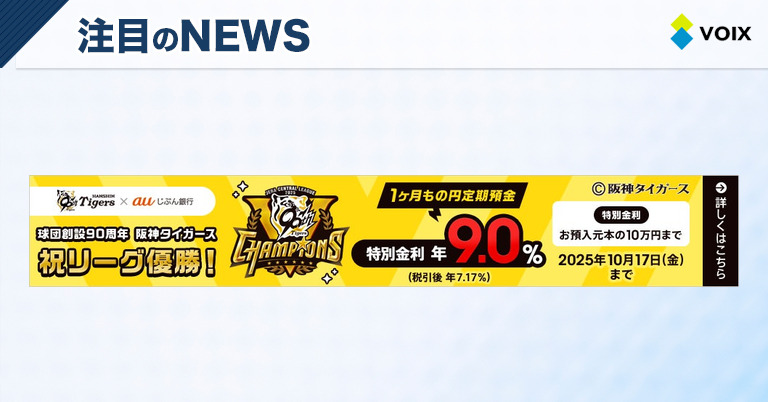 auじぶん銀行株式会社は、オフィシャルスポンサーを務める阪神タイガースのリーグ優勝を祝して「阪神タイガース リーグ優勝キャンペーン2025」を開始した。このキャンペーンでは、リーグ優勝翌日から2025年10月17日までの期間中、1ヶ月もの円定期預金に特別金利年9.0%を適用する。これは阪神タイガースの球団創設90周年を記念したもので、過去最高の金利となる。また、キャンペーン期間中には、甲子園駅の交通広告が優勝記念デザインに差し替えられる予定である。