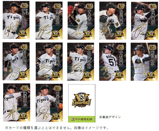 さらに、優勝特別展示に先駆けて明後日9月9日(火)から、甲子園歴史館にご入館の方、甲子園球場スタジアムツアーにご参加の方、または併設する「BE-STADIUM KOSHIEN」のご利用者を対象に、先着合計4万名様に優勝記念ロゴをデザインした全22種類の「優勝記念カード」を配布します。