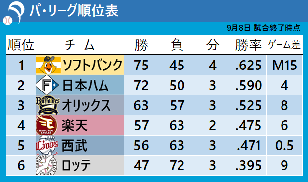 【パ・リーグ順位表】3位オリックスが6位ロッテに敗れ連勝ストップ 散発11安打2得点と好機生かせず(2025年9月8日掲載)|日テレNEWS  日テレNEWS NNNオリックス けがで離脱の森友哉 2か月ぶりに1軍出場選手に登録  nhk.or.jp【オリックス】2か月ぶりスタメンマスクの森友哉2安打1打点…攻守の要の復帰で12安打7得点快勝  au Webポータル【パ・リーグ順位表】3位オリックスが6位ロッテに敗れ連勝ストップ 散発11安打2得点と好機生かせず(日テレNEWS NNN)  Yahoo!ニュース8日のプロ野球(結果)オ-ロ  沖縄タイムス社