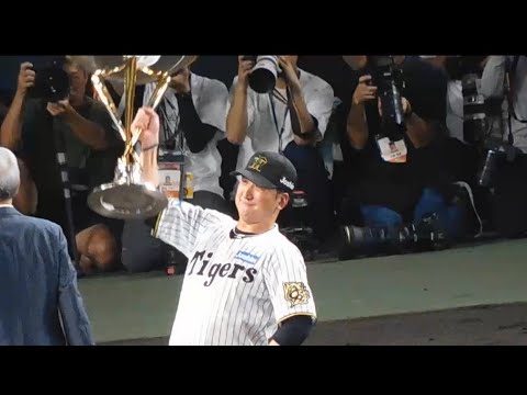 【優勝セレモニー】授与されたトロフィーを力強く掲げる藤川監督