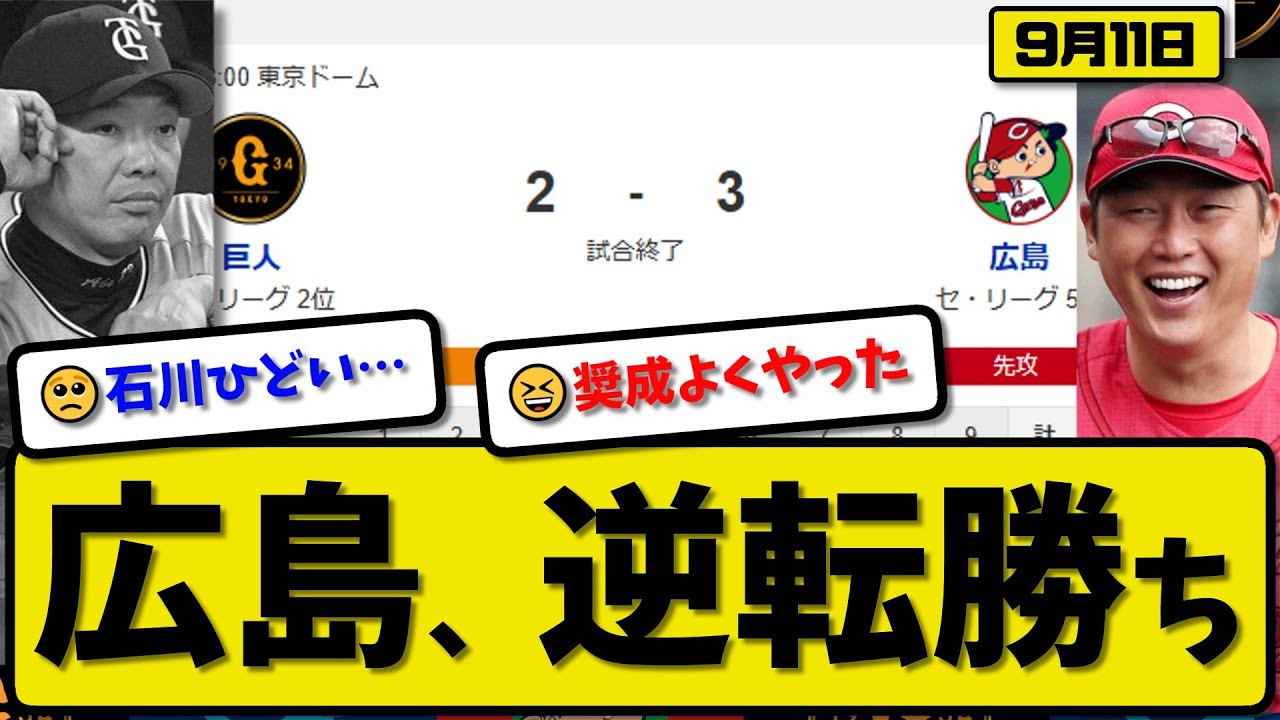 【セ2位vs5位】広島カープが読売ジャイアンツに3-2で勝利…9月11日逆転勝ち…先発髙6回2失点…小園&中村が活躍【最新・反応集・なんJ・2ch】プロ野球