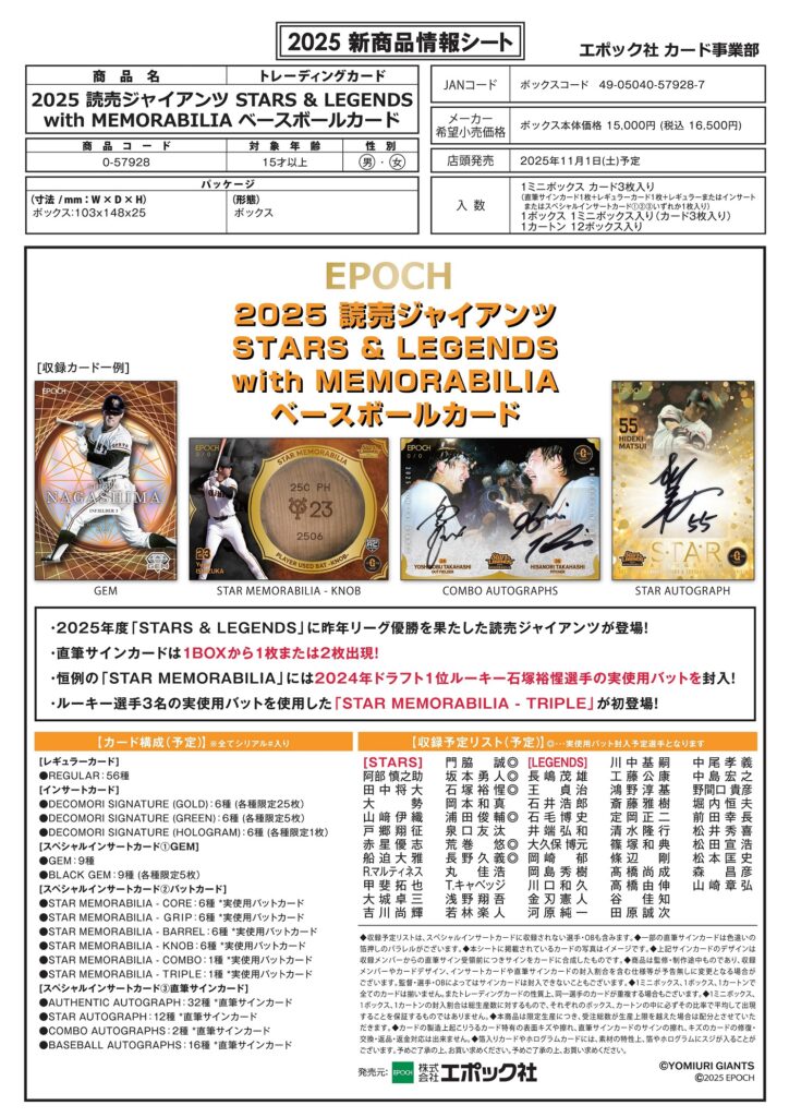 EPOCH 2025 読売ジャイアンツ STARS & LEGENDS with MEMORABILIA ベースボールカード