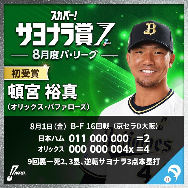 頓宮選手は8月1日(金)京セラD大阪で行われた対北海道日本ハム16回戦、1対2で迎えた9回裏、一死二、三塁の場面で左翼席へ劇的な逆転サヨナラ3点本塁打を放った。