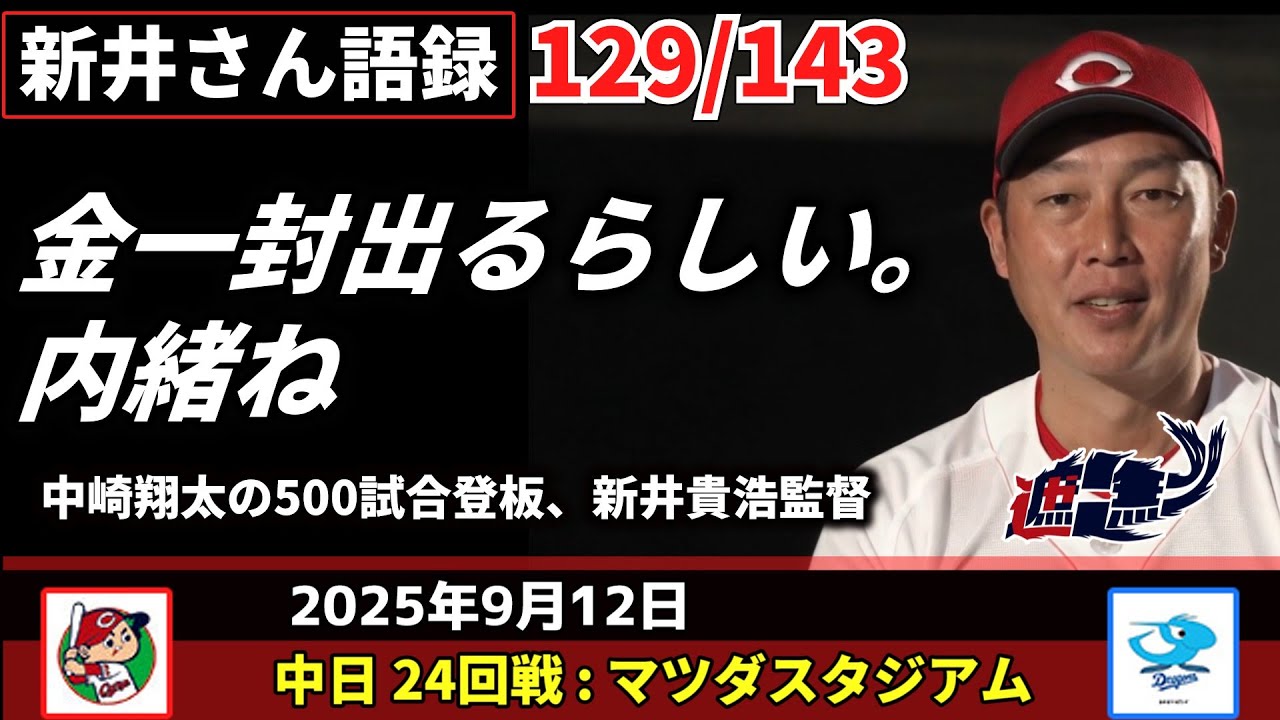 金一封出るらしい。内緒ね【新井監督語録:2025年9月12日】 中崎翔太の500試合登板、新井貴浩監督。