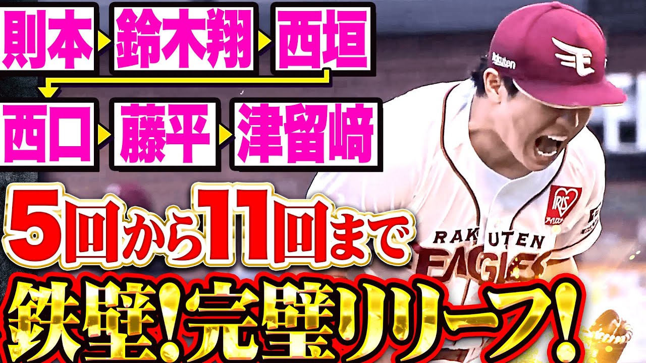 5回2死1,3塁のピンチの場面で登板となった東北楽天・則本昂大。ここを1球でセンターフライに打ち取り火消しに成功すると、次の回にも登板し3者凡退。そこから鈴木翔天、西垣雅矢、西口直人、藤平尚真、津留崎大成とつないで11回までパーフェクトリリーフ!! 1人の走者も許さず相手の反撃を封じた鉄壁リレーとなりました!!