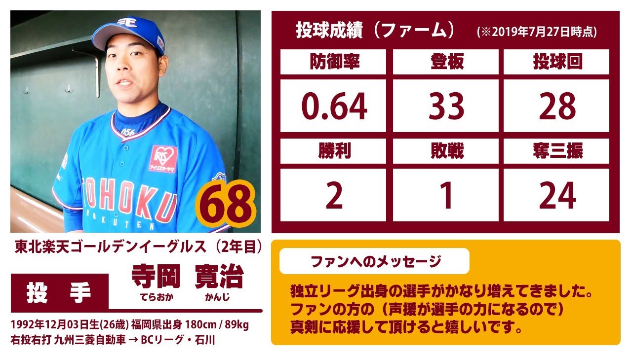 ルートインBCリーグ「石川ミリオンスターズ」から、2017年に東北楽天ゴールデンイーグルスにドラフト7位指名で入団した寺岡寛治投手。2019年、ファームで防御率0.64(7/27 時点)という好成績を収め、支配下登録された寺岡投手のインタビュー。さらに、川相昌弘氏・田尾安志氏から期待を寄せるコメントも。