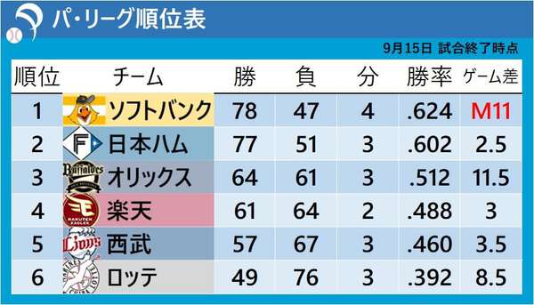 【パ・リーグ順位表】ソフトバンクと日本ハムが3連勝 オリックスと楽天は3ゲーム差に縮まる au Webポータル【ソフトバンク】〝カモ化〟オリックスに貯金12も警戒感「プロ野球には奇妙な相性や反動がある」(東スポWEB) Yahoo!ニュース柳町の先制打「達に回せばなんとかなる」 “命日”に捧ぐ白星…小久保監督のコメント 鷹フル「川村さんの力も借りて勝てたのかな」ソフトバンク中村晃が亡き恩人に捧げる一打「困ったときにいつでも助けてくれた」 西スポWEB OTTO!オリックス、V消滅…岸田監督「全員が悔しいと思っている」今季17度目零敗 サンスポ