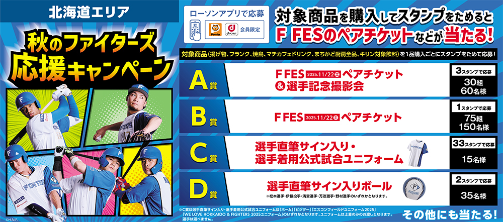 北海道エリアのローソンでは「秋のファイターズ応援キャンペーン」を、9月16日(火)より実施いたします。抽選で11月22日(土)開催《F FES 2025 Supported By Fanatics》「イベント付ペアチケット」や、「選手直筆サイン入り・選手着用公式試合ユニフォーム」などが当たるほか、コースを選択すれば「全国共通お食事券ジェフグルメカード」なども当たるキャンペーンとなります。この機会に北海道エリアのローソンに、ぜひお立ち寄りください。