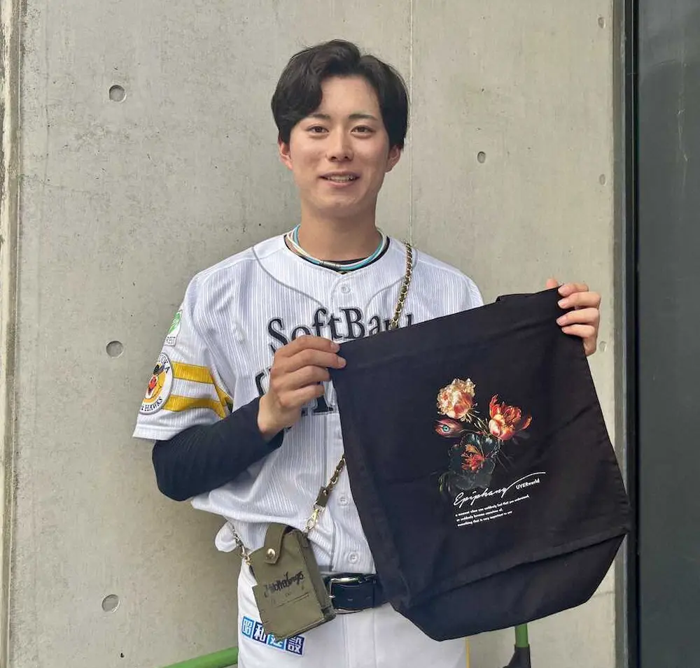 6月20日に支配下登録され、自分へのご褒美に購入したのは、こよなく愛するロックバンド「UVERworld」のトートバッグとポーチだ。記者会見のために阪神戦が行われる甲子園への移動中にネットで購入し、先日ようやく手元に届いた。「今年は我慢して生きてきた。外食も先輩に連れて行ってもらう時くらい」。ルーキーイヤーの今年はぜいたくを控えてきて、合計1万2700円の買い物に「今回のグッズはちょっと高かったので、ご褒美にやっと買えました」と笑顔を見せた。バッグは遠征に行く際にキャリーバッグとともに持ち、ポーチには財布とイヤホンを入れて私服にあわせて持つ予定とのこと。