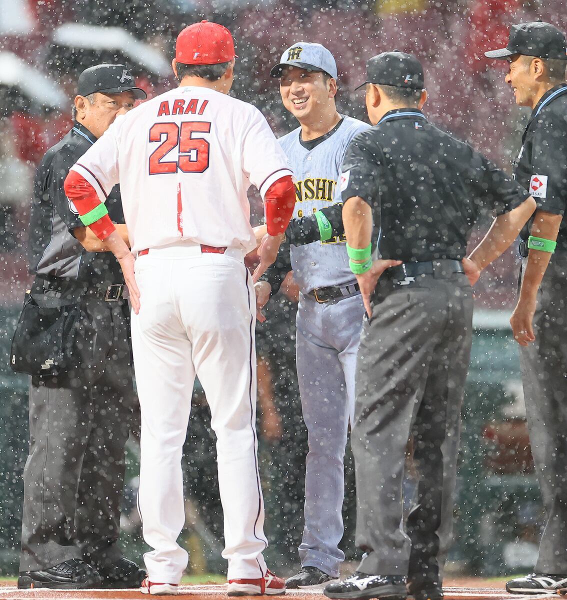 広島―阪神はプレーボール遅れる 藤川球児監督は大雨の中、全力疾走でメンバー表を交換(サンケイスポーツ) – Yahoo!ニュース Yahoo!ニュース【阪神】急な大雨の中…藤川球児監督のレアすぎる「猛ダッシュ」に観客から拍手起きる (日刊スポーツ) Yahoo!ニュース70分遅れのプレーボール 人気アイドルも急いで始球式 “大暴投”にどよめく カープOBは優しくフォロー au Webポータル広島―阪神はプレーボール遅れる 藤川球児監督は大雨の中、全力疾走でメンバー表を交換 サンスポ【阪神】試合直前の稲光と雷鳴に選手は不安げ…1時間以上遅れ試合開始 気まぐれな天気に翻弄 dメニューニュース