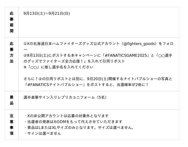 世界最大級のデジタルスポーツプラットフォームを運営するFanatics Inc.の日本法人、ファナティクス・ジャパン合同会社(東京都港区、マネジングディレクター:川名正憲、以下「ファナティクス・ジャパン」)は、2025年9月20日(土)にエスコンフィールドHOKKAIDOで開催される北海道日本ハムファイターズ主催のパ・リーグ公式戦 対 千葉ロッテマリーンズ戦において、オフィシャルオンラインストアおよびオフィシャルストア各店を運営するオフィシャルリテールパートナーとして、スポンサーデー「FANATICS GAME 2025」を開催いたします。