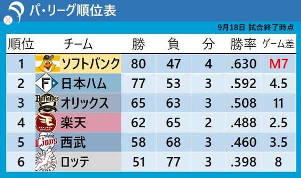 【パ・リーグ順位表】ソフトバンクが日本ハムに逆転勝利で優勝M7 西武はサヨナラ勝ち ロッテは大量リードで快勝  au Webポータル日本ハム・新庄監督 逆転許した8回振り返り「あそこでホームラン出ますかって」2位以内確定には…(スポニチアネックス)  Yahoo!ニュース《SHINJOの信条》思い切り全力を出し切って、10勝する気持ちでやっていきます  道新スポーツ【プロ野球結果】首位ソフトバンク 2位日本ハム制し マジック7  nhk.or.jp劇勝呼んだ「攻め」の継投【タカ番コラム好球筆打】  au Webポータル