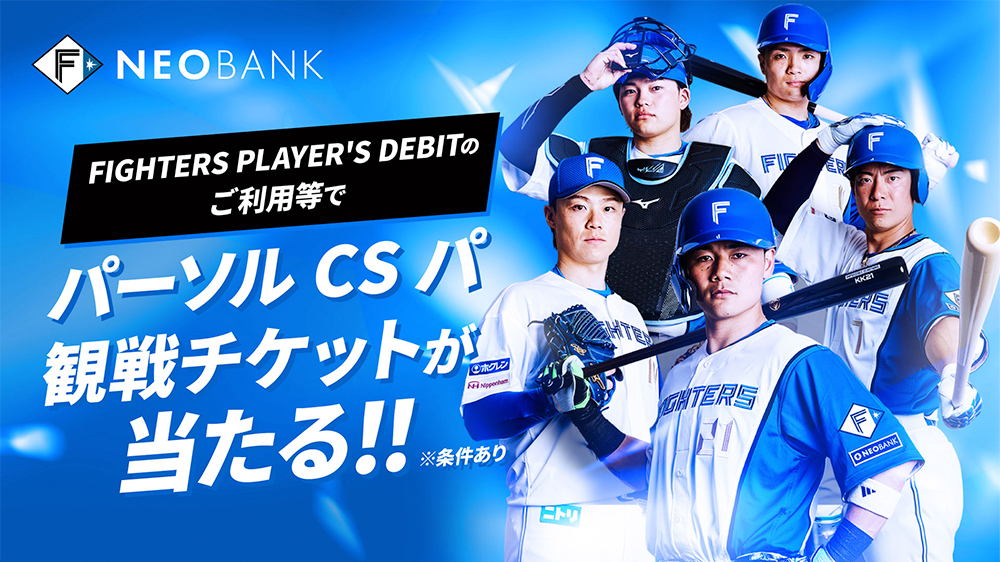F NEOBANK(住信SBIネット銀行ファイターズ支店)は、「2025 パーソル クライマックスシリーズ パ」進出記念キャンペーンを実施いたします。FIGHTERS PLAYER’S DEBITをお持ちの方のうち、条件を満たした方を対象に、デビットカード発行手数料の全額をキャッシュバックします!さらに、抽選で「2025 パーソル CS パ」観戦チケットが当たります!