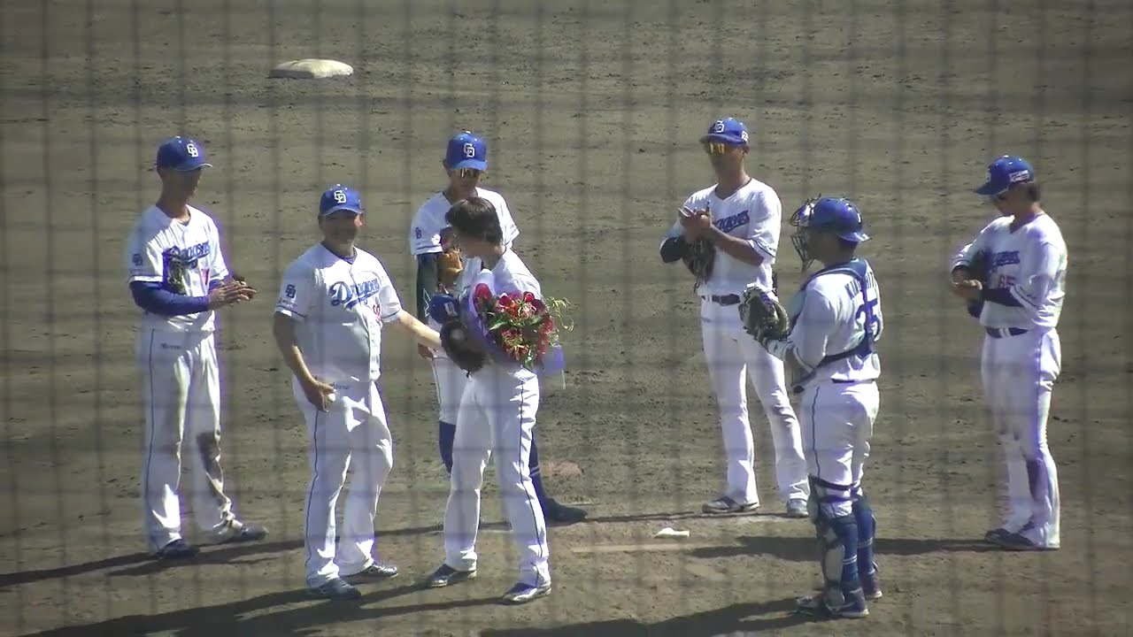 中日ドラゴンズ 岡田俊哉投手 ファーム最後の登板を終え田島慎二コーチから花束を渡される→祖父江大輔投手へのリレー→投球練習 2025/9/15 ナゴヤ球場 ボールデッド中 Chunichi Dragons中日ドラゴンズ田島慎二 NPBHUB.COM | The Fanbase of Nippon Baseball & Nippon Professional Baseball