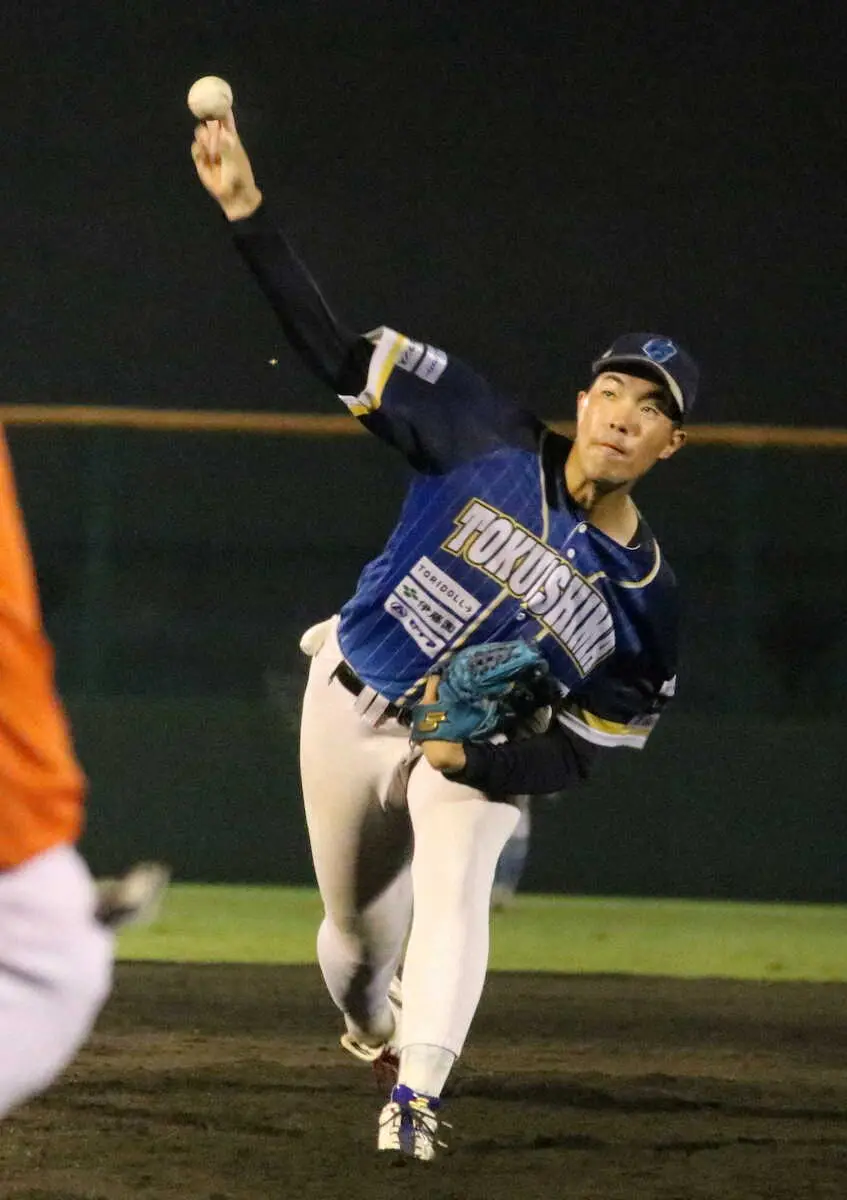 今秋ドラフト候補に挙がる徳島の最速157キロ右腕・篠崎国忠は、3回を被安打4、3失点で終えた。「このような大事な試合で投げたことがないので立ち上がりは緊張した。2回以降は変化球など自信のある球を使っていこうと意識を変えました」。独立・四国の年間総合優勝決定戦の初戦に先発登板。最速154キロを計測した一方で5四死球を許したものの、フォークを有効活用して我慢した。