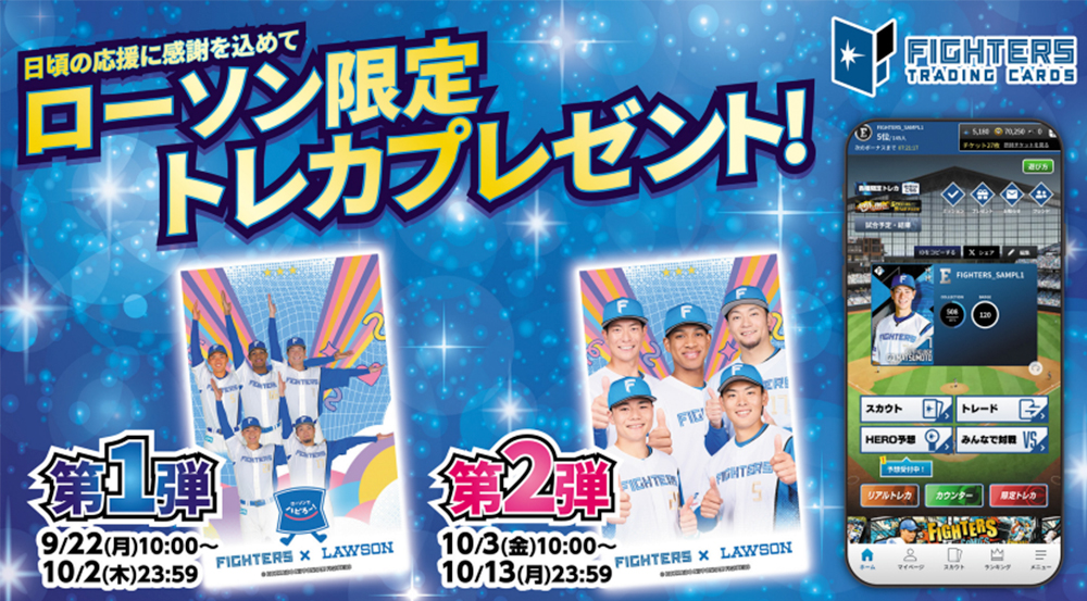北海道日本ハムファイターズ・オフィシャルコンビニエンスストアであるローソンでは、北海道エリアの店舗*にて「ローソン限定のファイターズトレカ」を9月22日(月)10時~期間限定で配布いたします。期間中、実施店舗に設置された端末にタッチしていただくと、限定トレカをGETいただけます。期間により、もらえるトレカが異なります(全2種)。ぜひ、この機会に北海道エリアのローソン店舗にお立ち寄りください。