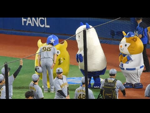 【マスコットもお見送り】挨拶を終え引き上げる阪神ナインを最後まで見送るDeNAマスコットたち 筒井コーチは頭を下げて挨拶